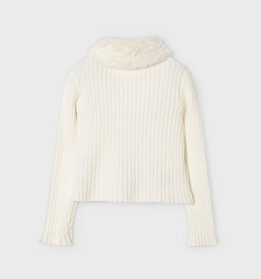MayoralSoft and cozy long sleeve top in a lovely warm white with cinched sleeves, purple velour classic collar, and empire waist with embroidered heart an...