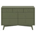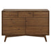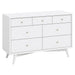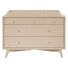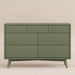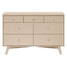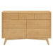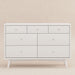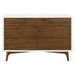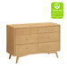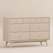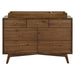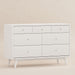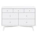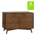 The Palma 7-drawer Double Dresser is a sophisticated mid-century inspired design with contrasting walnut stained drawers, tapered legs, brushed metal hardware, and smooth-glide drawers. It's a versatile modern piece, providing ample storage space with three top drawers and four larger bottom drawers. Pair with the Palma 4-in-1 Crib or Peggy 3-in-1 Crib for an elegant nursery.