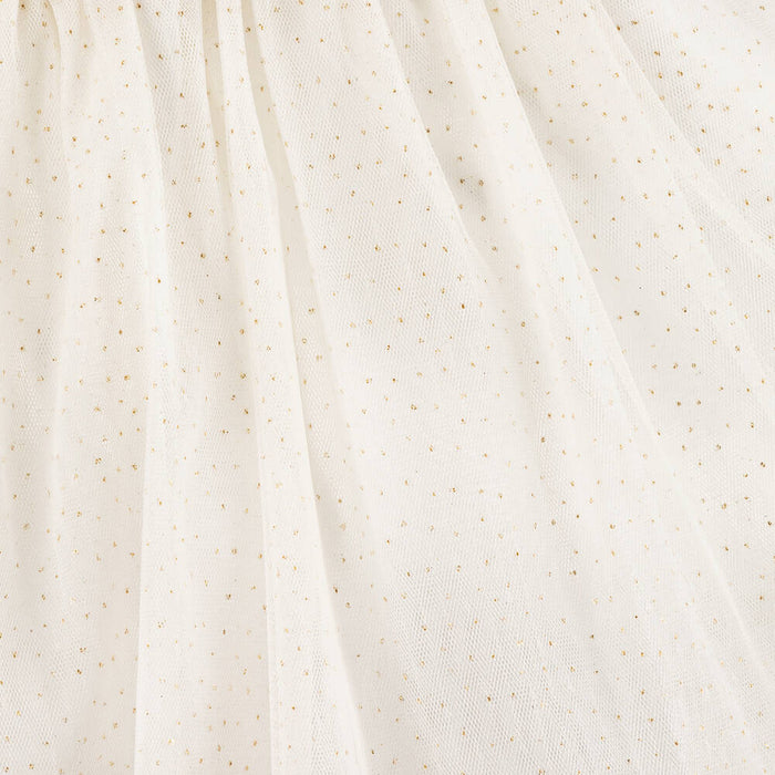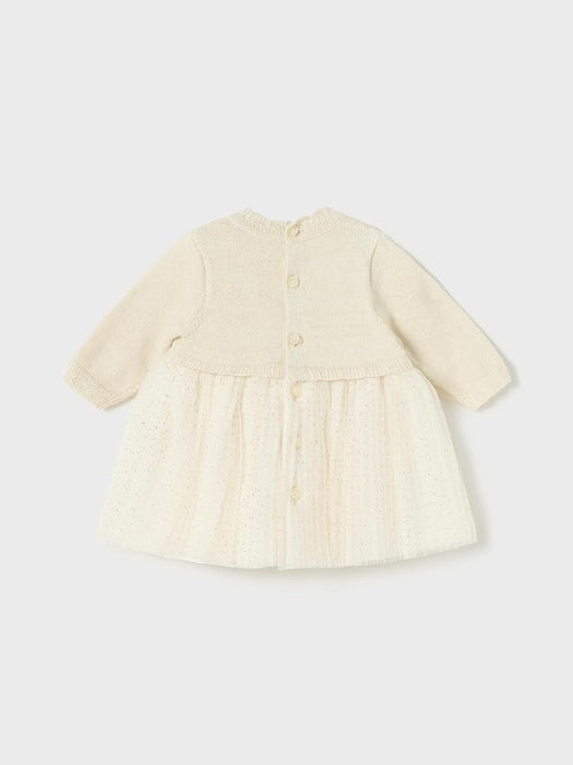 The perfect holiday or New Year’s Eve dress is here from Mayoral! A champagne dress with a knitted bodice and tulle skirt with gold woven throughout to add a touch of sparkle and shine to every occasion. Complete with cotton lining and a button up back are the perfect finishing touches to add comfort and ease of dressing needed to party in style all winter long.