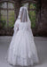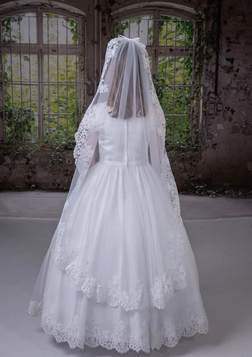 This traditional tea length short sleeve communion gown features a satin bodice with scalloped lace sleeve and satin belt with rhinestone accents. Layered tulle skirt with scalloped lace highlight. Zipper closure. Veil Included!