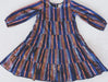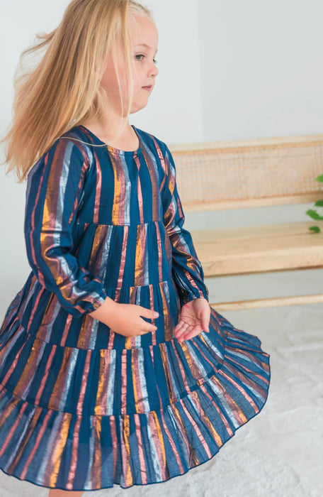 She is sure to shine brightly this holiday season in this beautiful 100% cotton dress with shimmery sparkly stripes in rose gold, silver and copper on a navy blue background. The adorable peasant style long sleeves and fully lined ruffled skirt with empire waistline makes this dress as comfortable as it is glamorous!.
