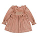 Glittery gold stars dance across this gorgeous blush rose colored velveteen dress that features long puffed sleeves with ruffled cuffs, a ruffled and smocked bodice, with a pretty tulle bow at the empire waistline. Fully lined in comfortable cotton. Zippered back makes for easy changes.