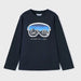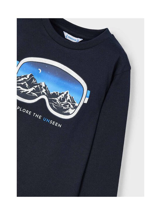 Mayoral boy’s navy long sleeve featuring a mountain view through goggles and the wording “explore the unseen”