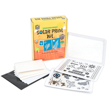 Combine art and science into one awesome experiment! The Solar Print Kit allows you to make cool designs using a chemical reaction that relies on the power of the sun. Place objects on top of a sheet of the light-sensitive solar print paper and expose it to the sun. A quick rinse in water makes the image permanent to save and display.