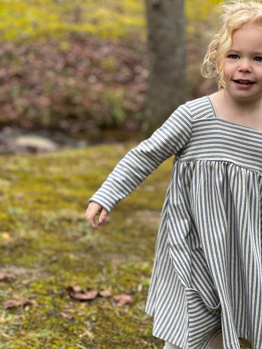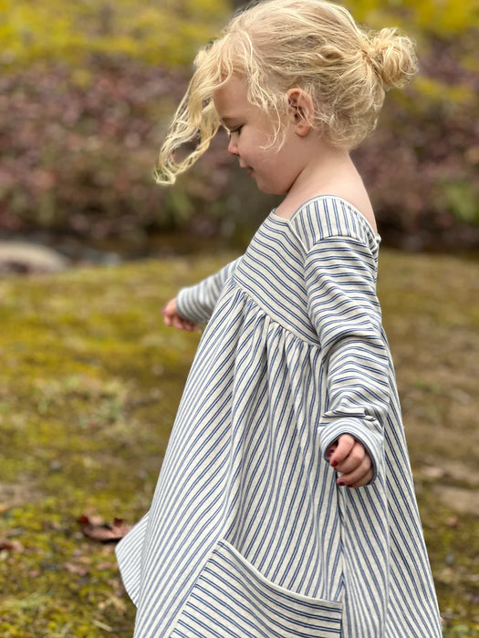 Vignette's answer to the little black dress. Our Rylie Dress is a perennial favorite thanks to its comfortable styling, lovely jersey and ohhhhh those pockets! The Rylie Dress in blue stripe is a fall and winter must have! Pair it over your favorite leggings or tights for a picture perfect look!